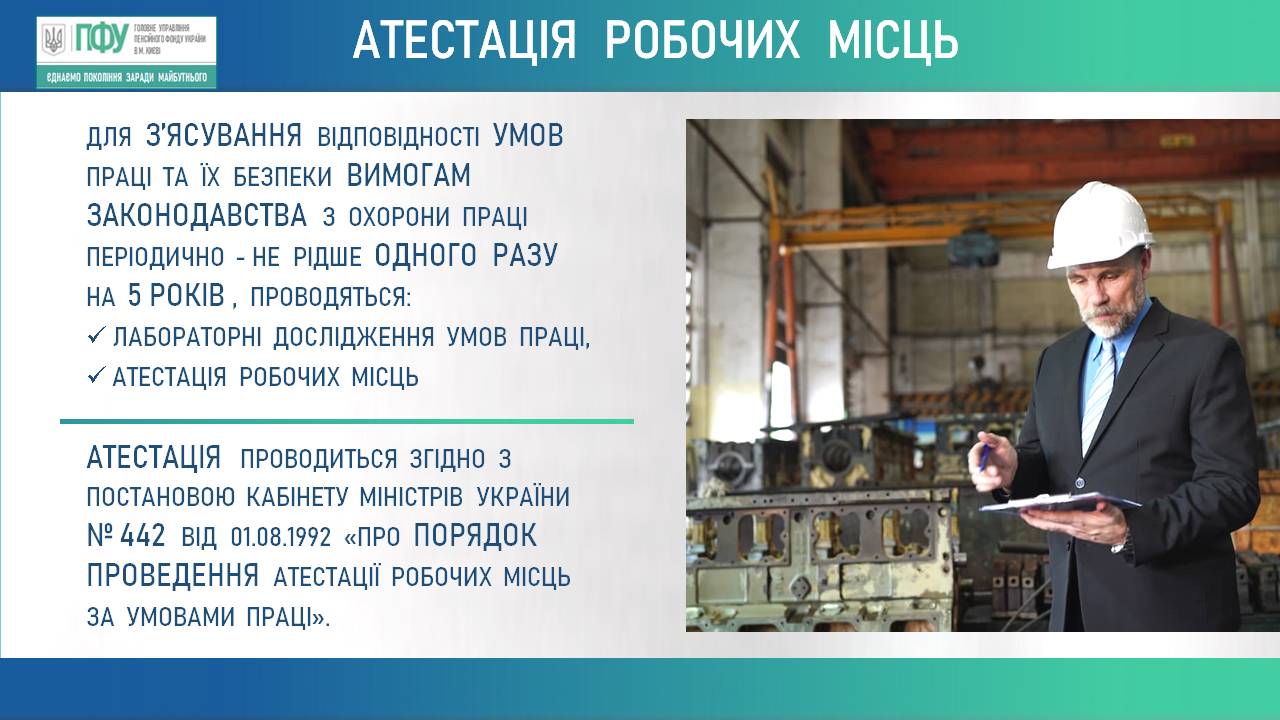 Для з’ясування відповідності умови праці та її безпеки вимогам законодавства з охорони праці періодично (не рідше одного разу на 5 років) проводяться лабораторні дослідження умов праці, атестація робочих місць згідно з постановою Кабінету Міністрів України № 442 від 01.08.1992 «Про порядок проведення атестації робочих місць за умовами праці».