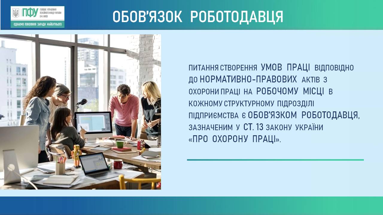 Питання створення умов праці відповідно до нормативно-правових актів з охорони праці на робочому місці в кожному структурному підрозділі підприємства є обов’язком роботодавця, зазначеним у ст. 13 Закону України «Про охорону праці».